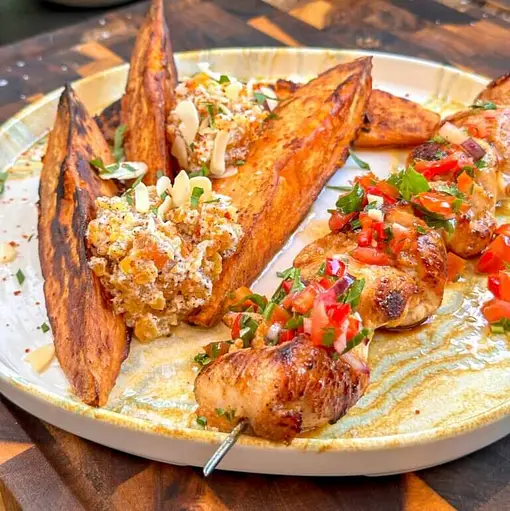 With a sweet, creamy interior and slightly crisp exterior, these grilled sweetpotato wedges, paired with juicy chicken skewers, are a must-try BBQ side dish. Sweetpotatoes are often overlooked in warmer months, but they deserve a spot on your grill this BBQ season. There’s no need to boil them beforehand, just slice and season, then let the grill do the rest. Grilling sweetpotatoes also brings out their natural sweetness whilst giving them that irresistible char. Paired with delicious chicken skewers and bold, vibrant dips, this dish is a flavour-packed showstopper that’s perfect for sharing.