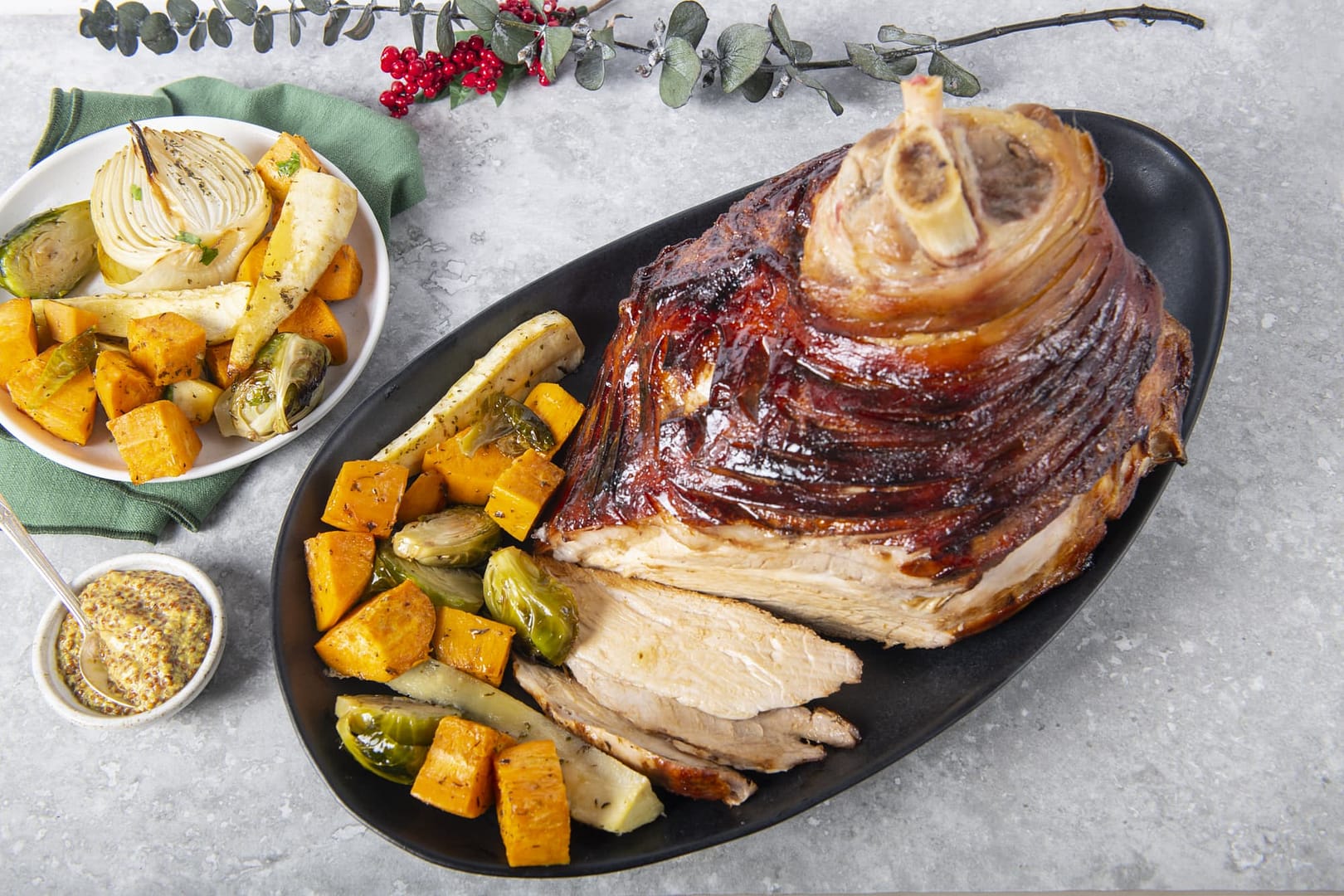 Serve the pork finely sliced alongside the roasted vegetables, with any juices from the pork poured over.