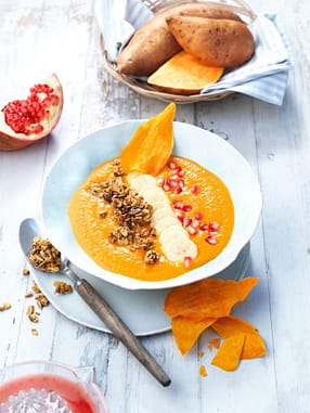 The sweet flavour of the sweetpotato pairs perfectly with the citrusy blood oranges and bananas. Topped with a crunchy seed mix and fresh pomegranate seeds, this smoothie bowl offers a delightful combination of textures and flavours. Not only is it a tasty way to start your day, but it’s also a great addition to your list of healthy breakfast ideas.