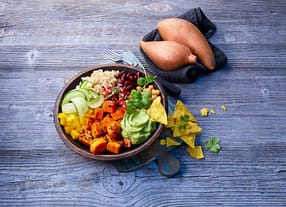 For a vibrant and nutritious lunch option, this Sweetpotato Burrito Bowl is hard to beat. Roasted sweet potato chunks add a touch of natural sweetness to this Mexican-inspired dish, which also features black beans, fresh vegetables, and a zesty dressing. It’s easy to assemble ahead of time in individual containers for grab-and-go convenience.